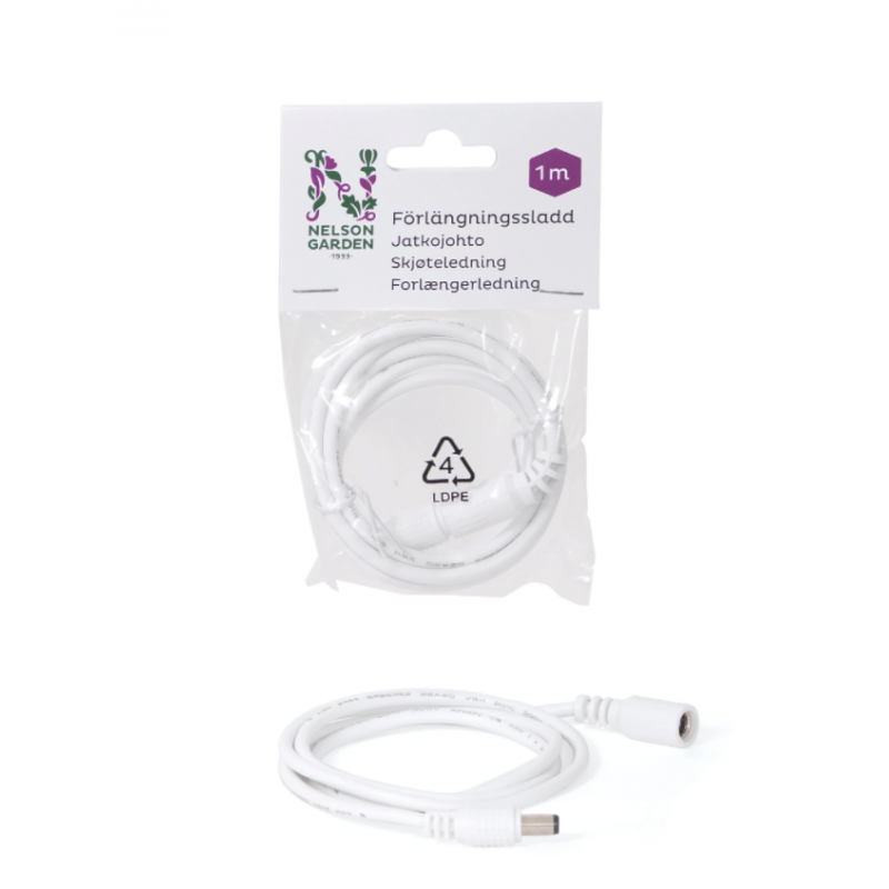 LED-valaisinten liittämiseksi yhteen kauemmas toisistaan, esim. eri hyllyille. Maadoittamaton johto, 1m, DC-tulppa 3,0x6,3mm, max 3A, 12-36 V DC.