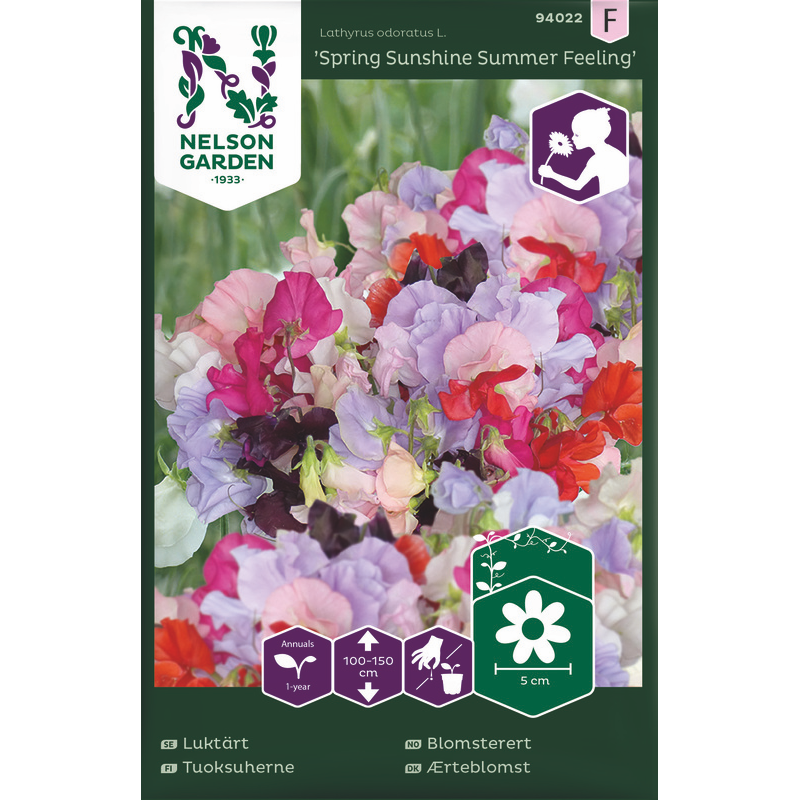 Matalakasvuinen, tuoksuva ja tiivis tuoksuherneseos. Seoksessa on roosan, punaisen, sinisen, violetin ja valkoisen sävyjä.