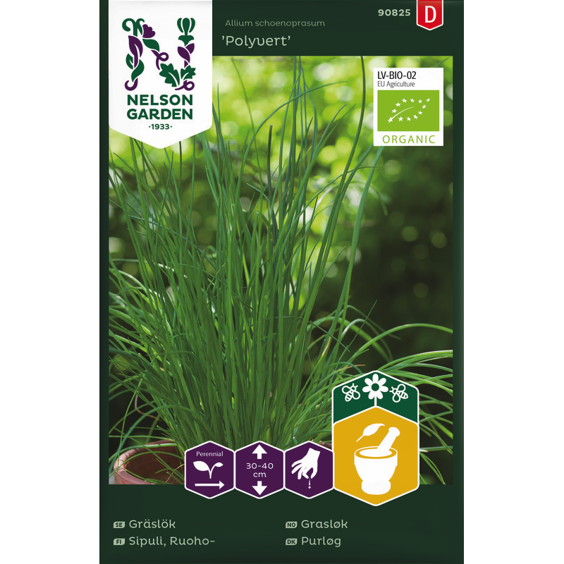 Luomulaatuinen siemen. Ruohosipulin lehdissä on hieno aromi ja mieto sipulinmaku. Kukat liilat, kauniin pyöreät. Korjaa lehtiä vähitellen ja käytä tuoreena salaattiin ja kylmiin kastikkeisiin. Myös syötävät kukat käyvät koristeeksi.