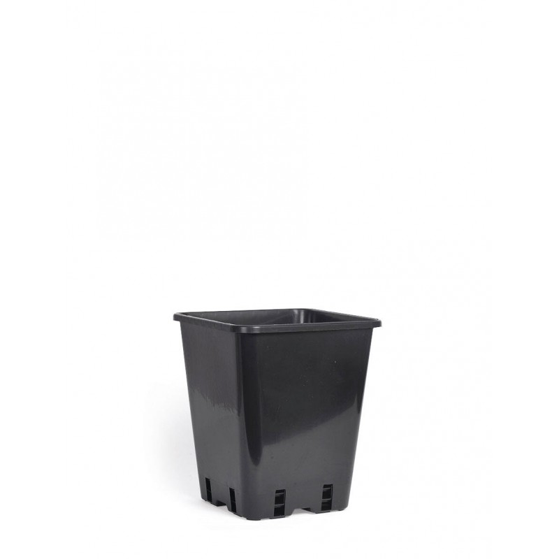 Neliskulmainen musta muoviruukku. Vahva materiaali, uudelleen käytettävä. Polypropeenia (PP).